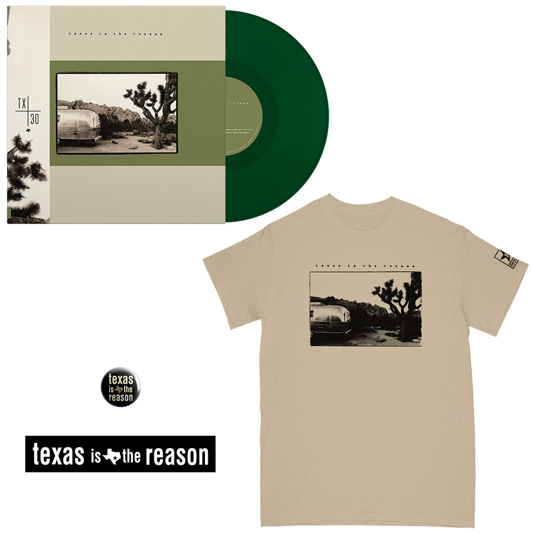 The Texas Is The Reason "TX30 Special Edition" bundle #1 features an "EP Cover" t-shirt on a color of your choice, sticker, button, and the "Texas Is The Reason: TX30 Special Edition" 12"ep on green vinyl.